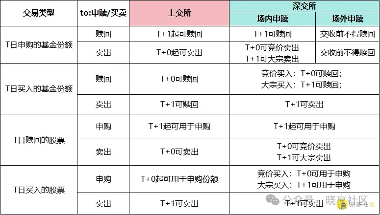 (一)当日竞价买入的 ETF 份额,当日可以赎回;当日大宗买入的 ETF 份额,次一交易日可以赎回;(二)当日通过本所申购的 ETF 份额,当日可以竞价卖出,次一交易日可以赎回或者大宗卖出;(三)当日通过本所赎回得到的股票,当日可以竞价卖出,次一交易日可以用于申购 ETF 份额或者大宗卖出;(四)当日竞价买入的股票,当日可以用于申购 ETF 份额;当日大宗买入的股票,次一交易日可以用于申购 ETF 份额;(五)当日通过登记结算机构申购的 ETF 份额,在交收前不得卖出或者赎回。
