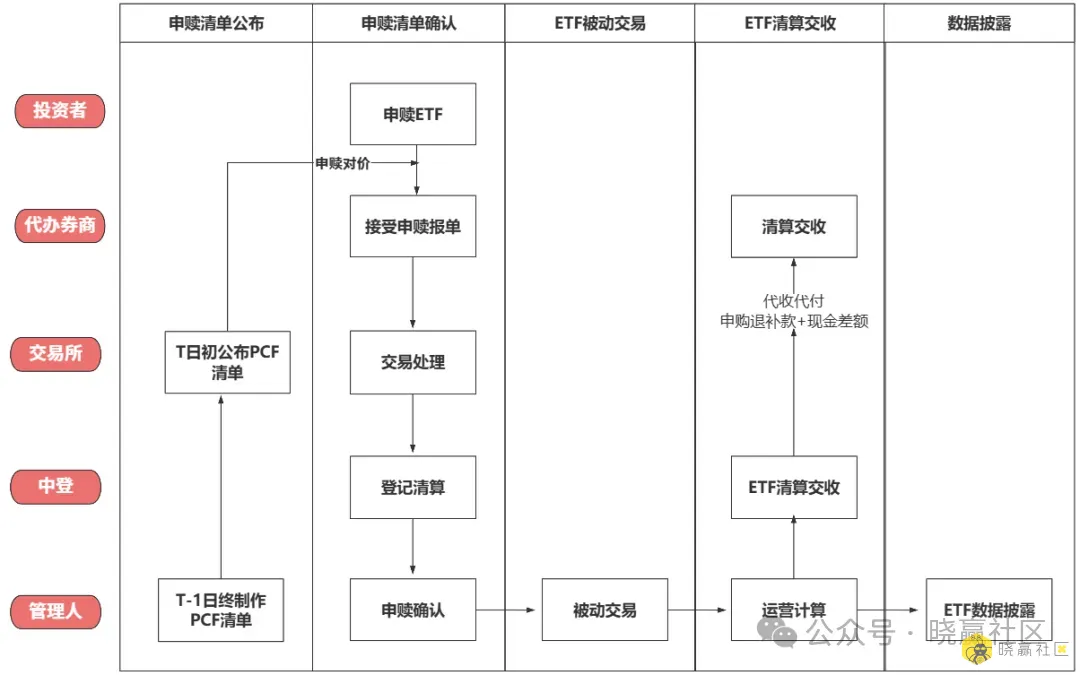 基金管理人要在开市前(6:00前)向交易所提交当日的PCF清单,PCF清单信息包括:ETF的基本信息,最小申购赎回单位资产净值,现金差额以及成份股的信息等。投资者依据当日PCF清单进行申购赎回。申购用一篮子股票换取ETF份额,赎回时则是以基金份额换回一篮子股票。