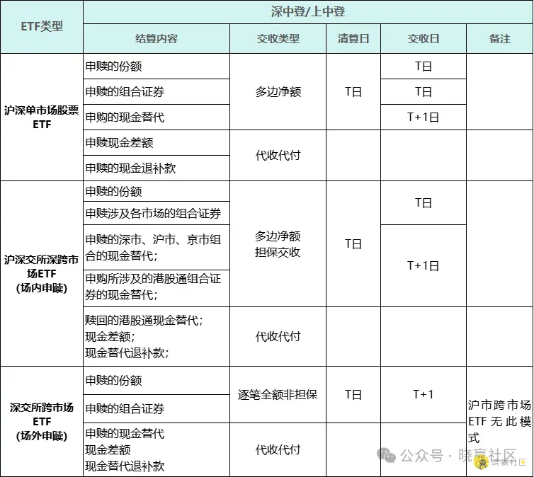 目前,股票ETF申赎结算规则已跟A股模式相同,即份额和组合证券T+0交收,资金T+1交收。ETF份额、组合证券、现金替代为多边净额担保交收,现金差额和现金替代退补款则是代收代付。