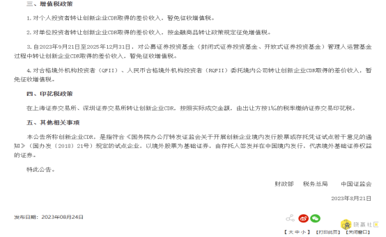 根据2023年8月24日财政部发布的《关于继续实施创新企业境内发行存托凭证试点阶段有关税收政策的公告》,明确自2023年9月21日至2025年12月31日,公募证券投资基金管理人运营基金过程中转让创新企业CDR取得的差价收入暂免征收增值税。